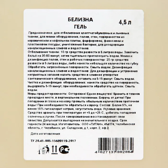 Белизна-Гель TITAN, 4,5 л — Характеристики