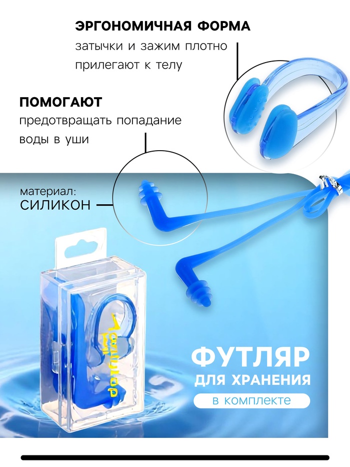Набор предназначен для предотвращения попадания воды и микроорганизмов в уши во время плавания. За счёт эргономичной формы затычки и зажим плотно прилегают к телу.