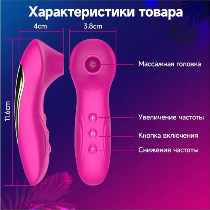 Вакуумно-волновой стимулятор выполнен из медицинского силикона. Игрушку можно использовать для стимуляции разных зон, таких как: соски, клитор, половые губы. Бесконтактная вакуумная стимуляция клитора обеспечит быстрый и яркий оргазм. Игрушку можно использовать во время секса с партнёром, для дополнительной стимуляции отдельных зон, также в соло. Стимулятор имеет 10 режимов, которые удобно переключать двумя кнопками. Игрушка водонепроницаема, что позволит использовать её в душе. Питание от аккумулятора с напряжением 3,7 Вт.
