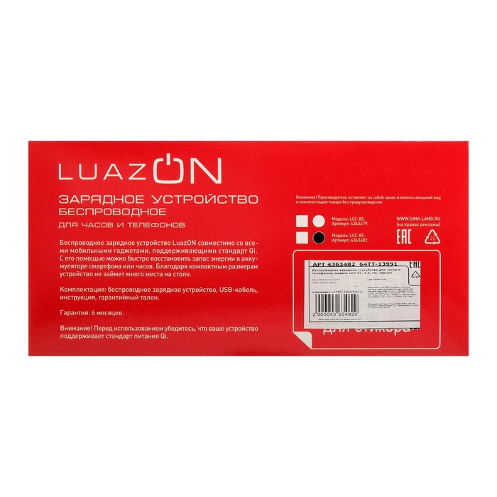 Беспроводное зарядное устройство Luazon для часов и телефонов, модель LCC-85, 2A, 1 м, чёрное — Характеристики