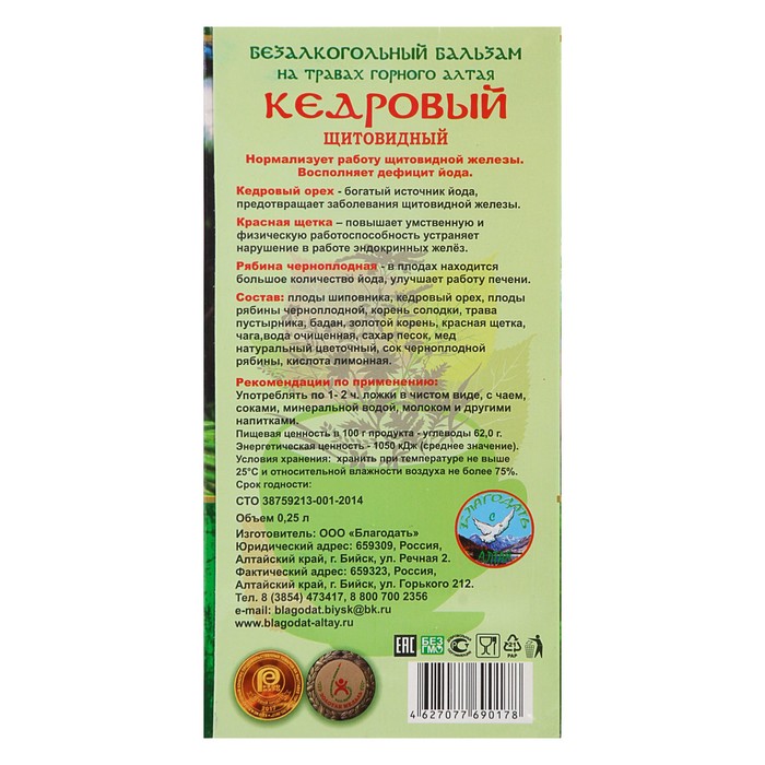 Бальзам «Кедровый» — эффективное средство для профилактики заболеваний щитовидной железы. Нормализует её функционирование и восполняет дефицит йода, повышает работоспособность и внимание.