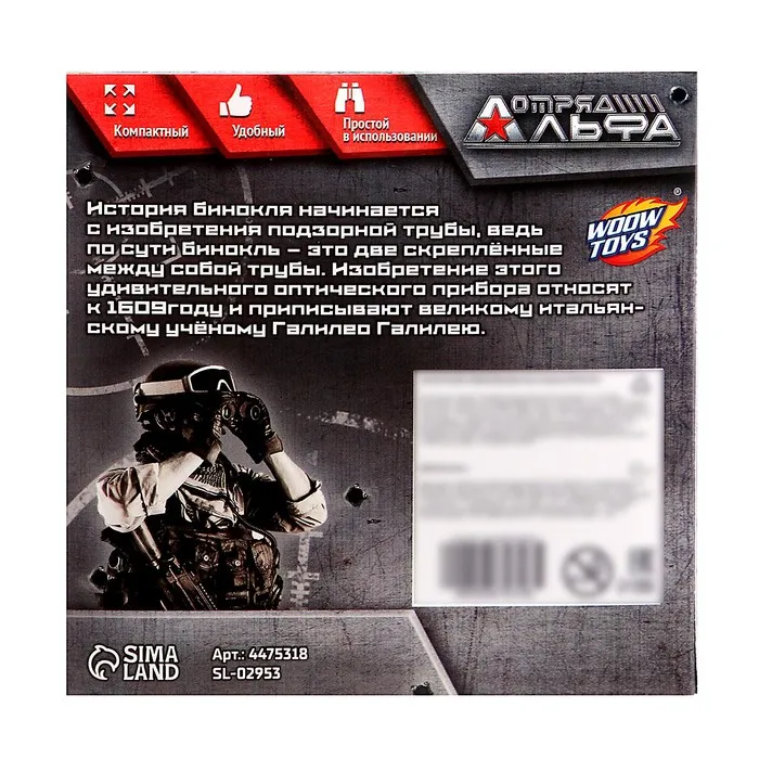 • Бинокль «Отряд Альфа» защищён от ударов и царапин, сделан из высококачественного нетоксичного пластика, который полностью безопасен для детей.