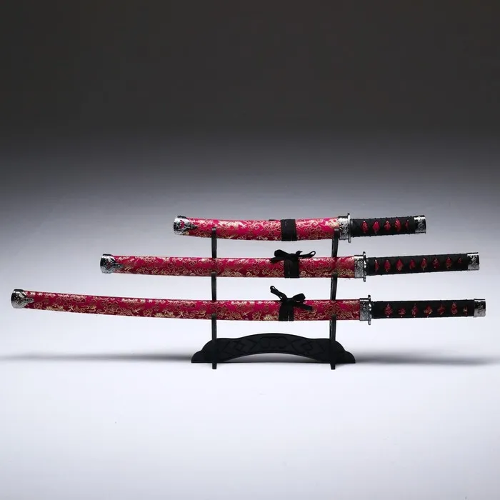 Макет оружия «Сувенирные катаны на подставке 3в1. Драконы на бордовом», подарочный набор, ножны ткань, 47 см; 70 см; 89 см
