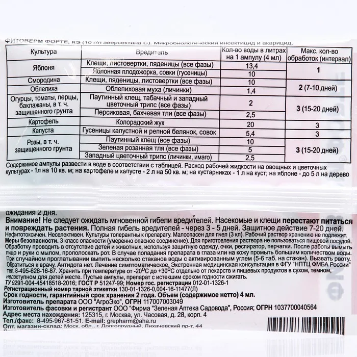 БИО инсектицид "Фитоверм-ФОРТЕ", от вредителей растений, пластиковая ампула 4 мл — Характеристики