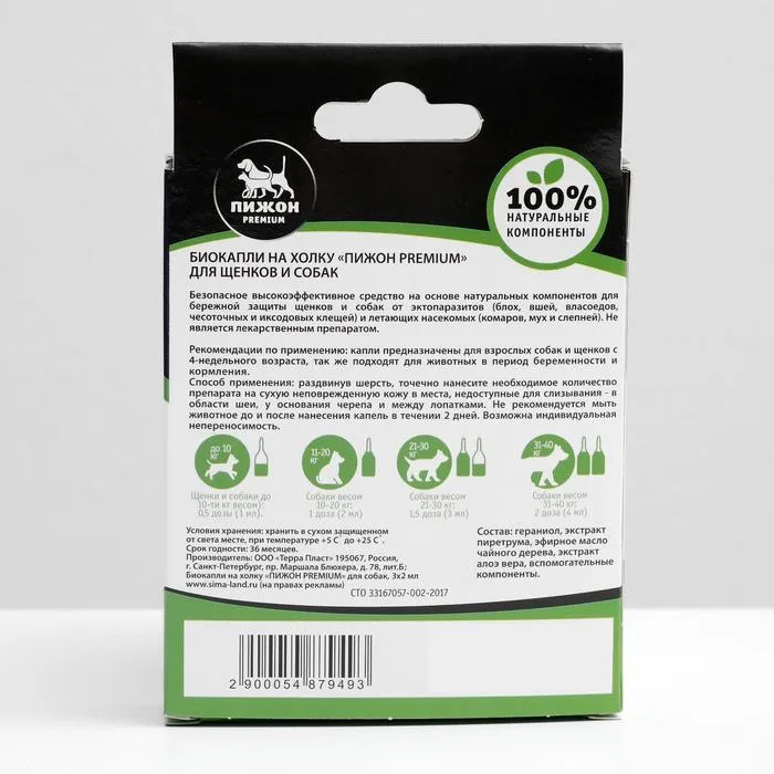 Био капли для животных от блох и клещей "ПИЖОН Premium" для собак, до 40 кг, 3х2 мл — Характеристики