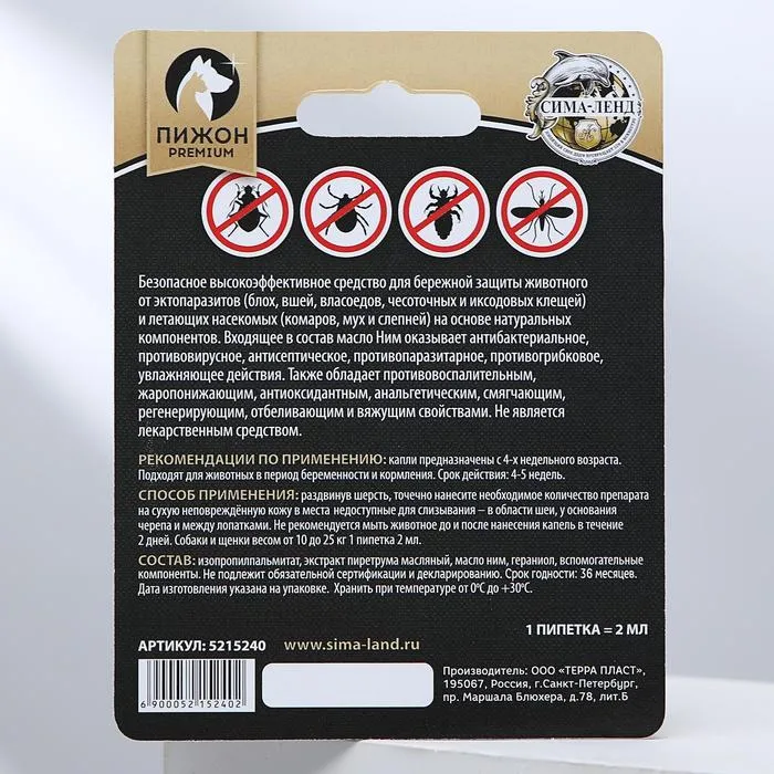 Это безопасное высокоэффективное средство для бережной защиты животного от эктопаразитов (блох, вшей, власоедов, чесоточных и иксодовых клещей) и летающих насекомых (комаров, мух и слепней) на основе натуральных компонентов.