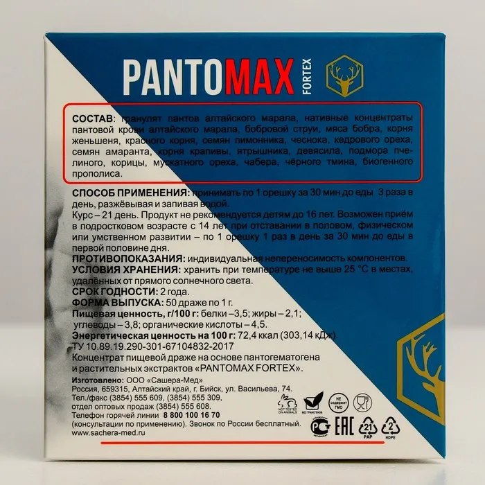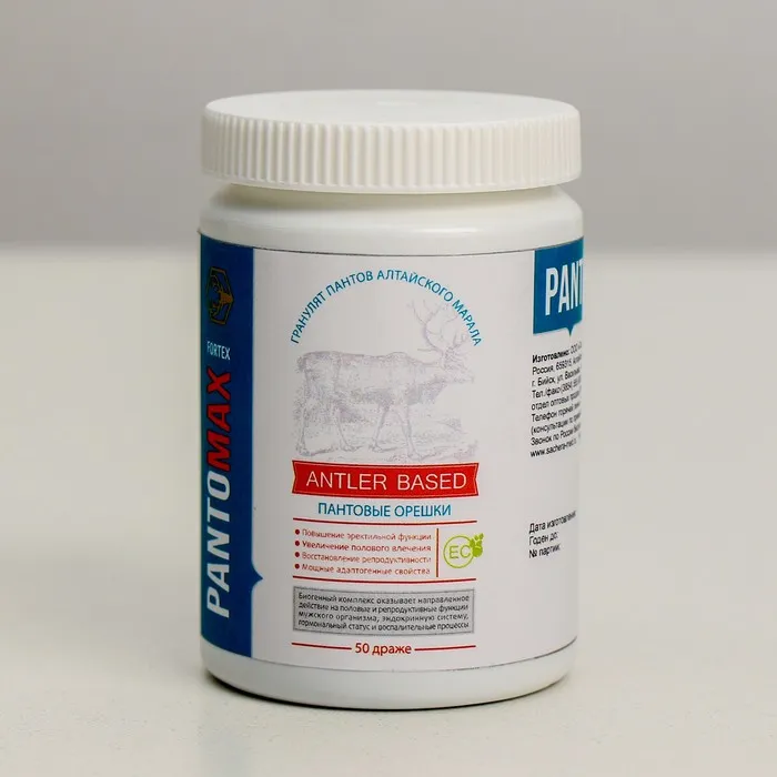 PantoMax Fortex – биогенный продукт на основе гранулята пантов алтайского марала, обогащённый микросферами концентратов активных структур растений и природных компонентов, направленный на регуляцию функций и состояния органов мочеполовой, эндокринной, нервной системы мужчин, нормализацию эректильной функции, восстановление биохимического равновесия синтеза гормонов и функций органов репродуктивной системы.