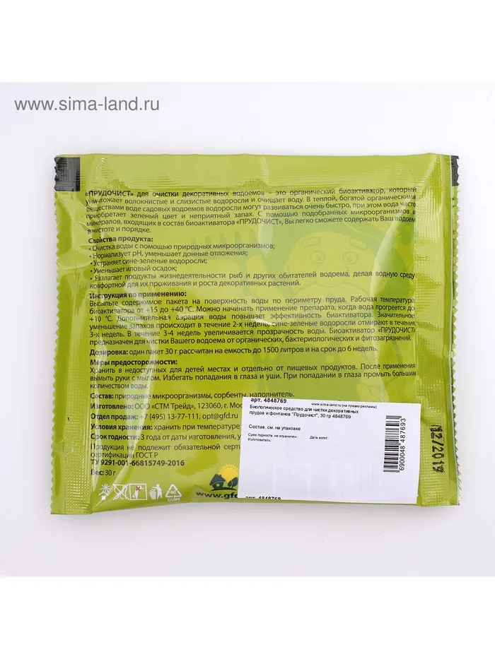 Способ применения: высыпать содержимое пакета на поверхность воды по периметру пруда. Рабочая температура биоактиватора +15 +40С. Можно начинать применение препарата, когда прогреется до +10С. Дополнительная аэрация воды повышает эффективность биоактиватора. Значительное уменьшение запахов происходит в течение 2-х недель, сине-зеленые водоросли отмирают в течение 3-х недель. В течение 3-4 недель увеличивается прозрачность воды. Биоактиватор предназначен для очистки Вашего водоема от органических, бактериологических и фито загрязнений. Флакон 200 мл рассчитан на емкость до 2000 литров и на срок до 8 недель.