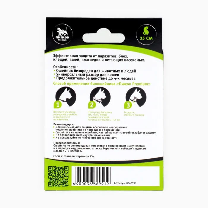Биоошейник антипаразитарный "Пижон Premium" для кошек и собак, чёрный, 35 см — Характеристики