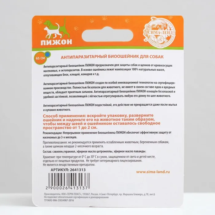 Антипаразитарный биоошейник "ПИЖОН" предназначен для защиты собак и щенков от кровососущих насекомых и эктопаразитов. В основе ошейника лежит композиция 100% натуральных масел, отпугивающих блох, клещей, комаров и т.д.