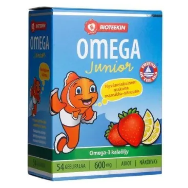 BIOTEEKKI OY Omega-3 Junior 54 капсулы со вкусом клубники и лимона. Продукт изготовлен из экологически чистого рыбьего жира.
