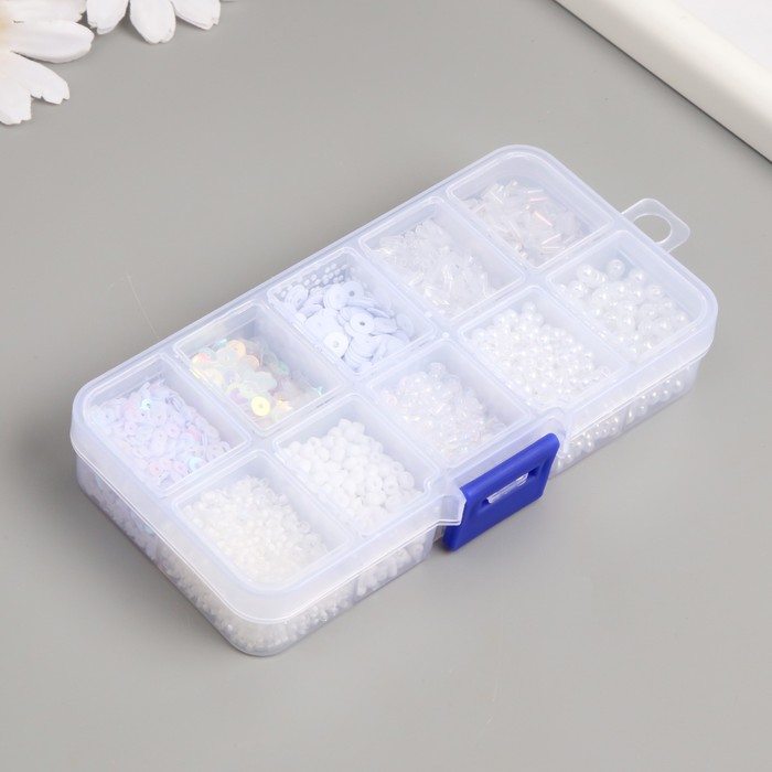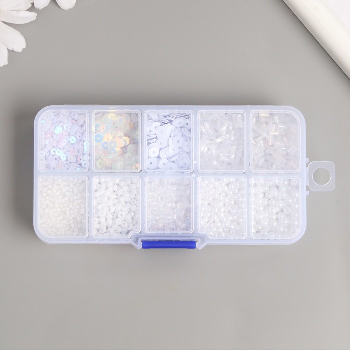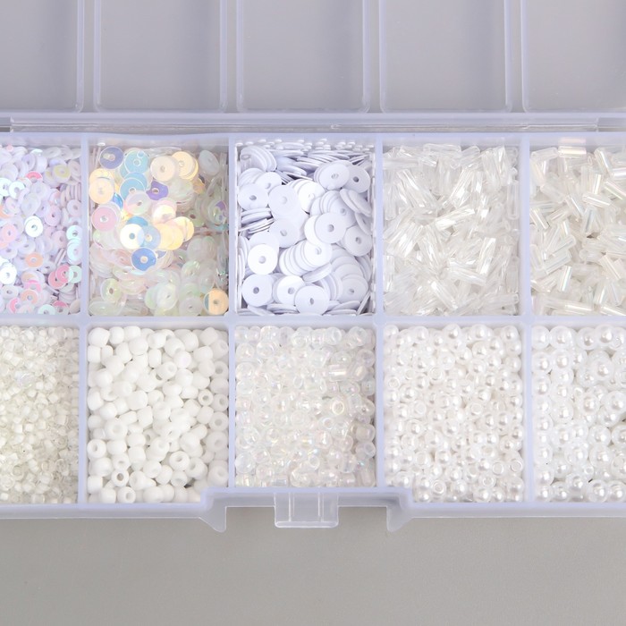 Бисер стекло 8/0, 12/0 в шкатулке «Белый», бусины, стеклярус и пайетки, 13×6.5×2.3 см — Характеристики