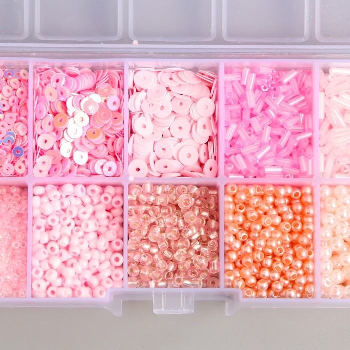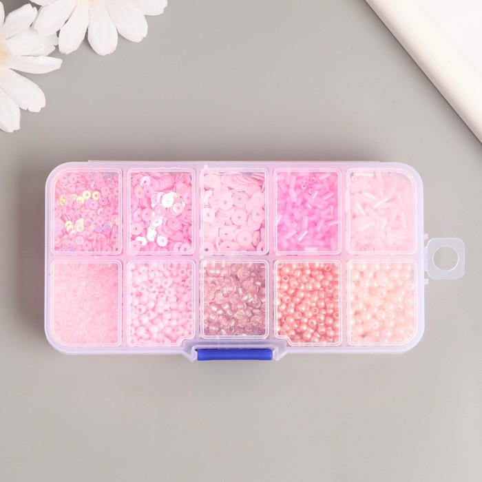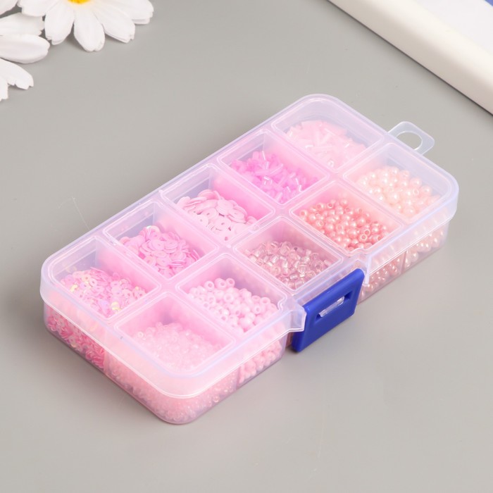Бисер стекло 8/0, 12/0 в шкатулке «Розовый», бусины, стеклярус и пайетки, 13×6.5×2.3 см — Характеристики