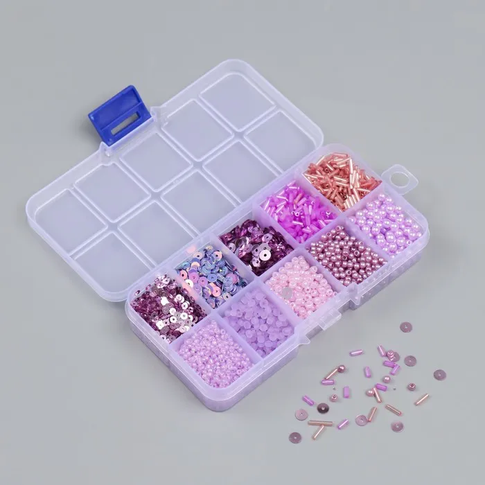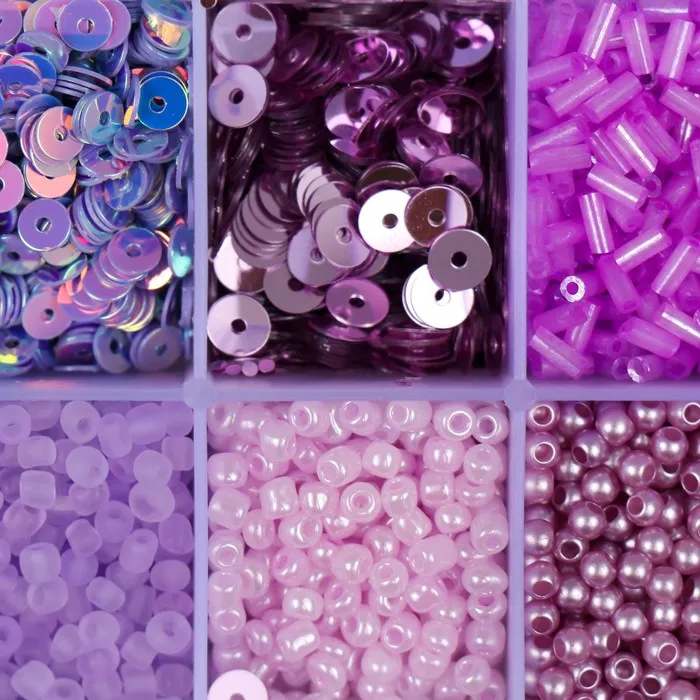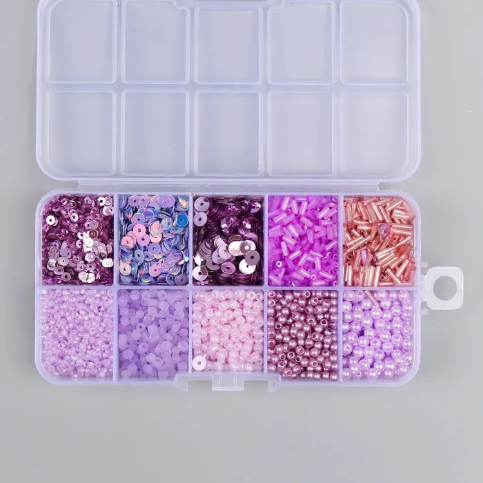 Бисер стекло 8/0, 12/0 в шкатулке «Сиреневый», бусины, стеклярус и пайетки, 13×6.5×2.3 см — Характеристики