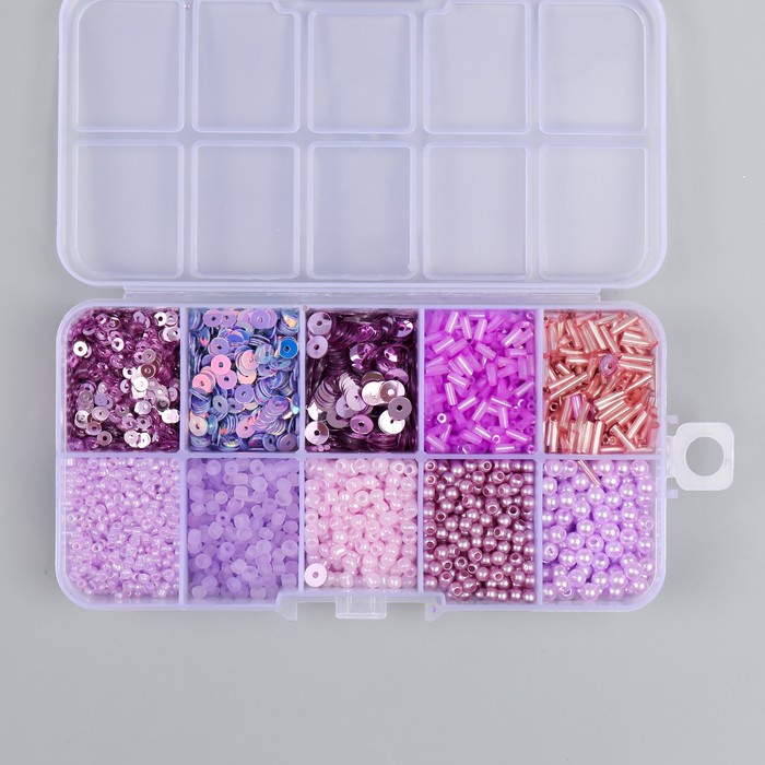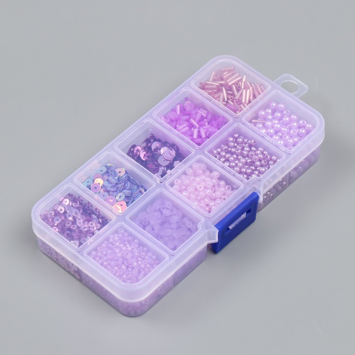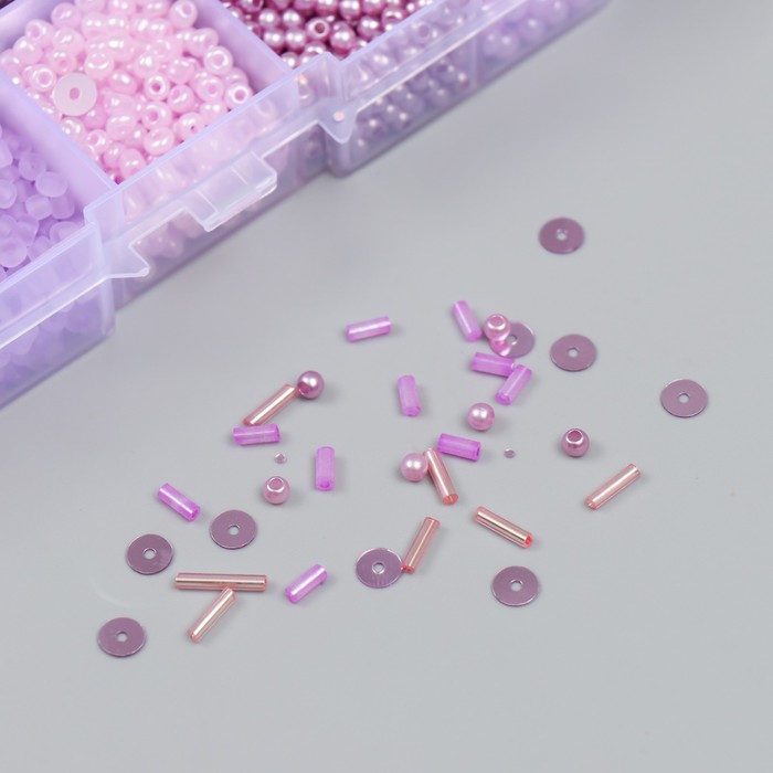 Бисер стекло 8/0, 12/0 в шкатулке «Сиреневый», бусины, стеклярус и пайетки, 13×6.5×2.3 см