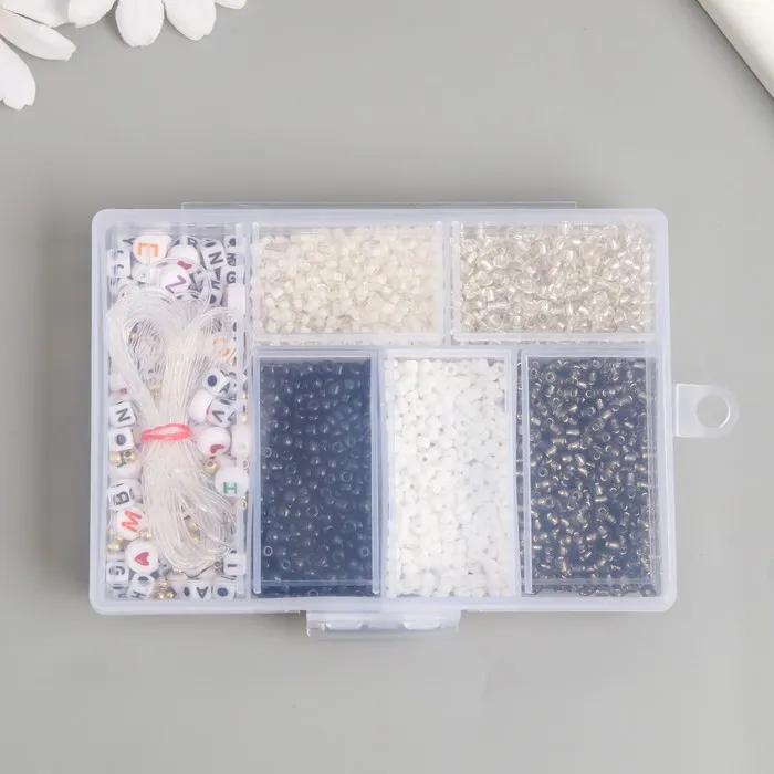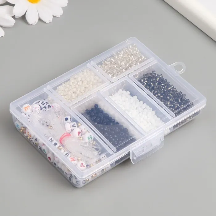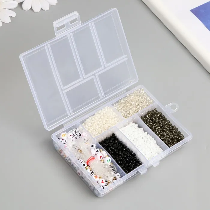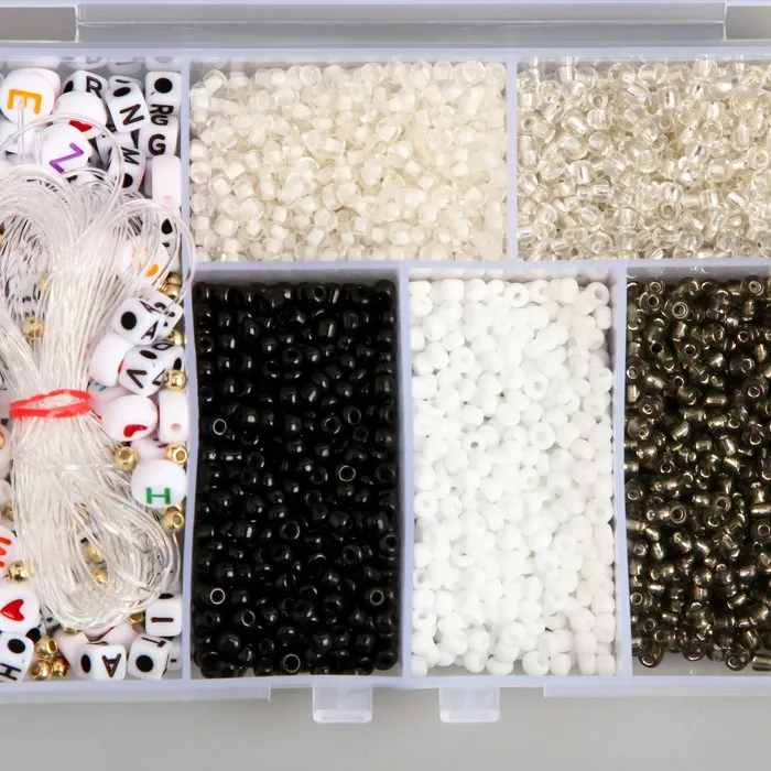 Бисер стекло 8/0 в шкатулке «Чёрно-белый», бусины + нить 0.8 мм, 5 м, 12×8.4×2.2 см — Характеристики