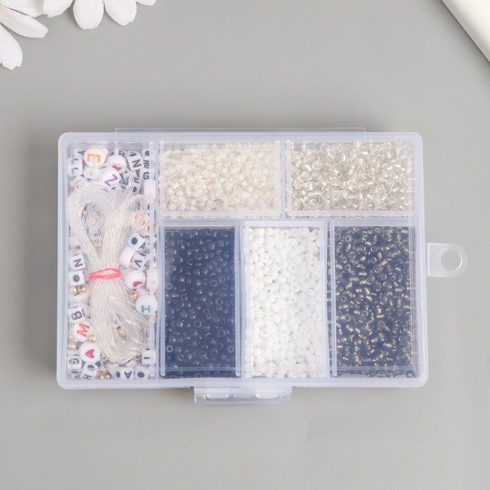 Бисер стекло 8/0 в шкатулке «Чёрно-белый», бусины + нить 0.8 мм, 5 м, 12×8.4×2.2 см