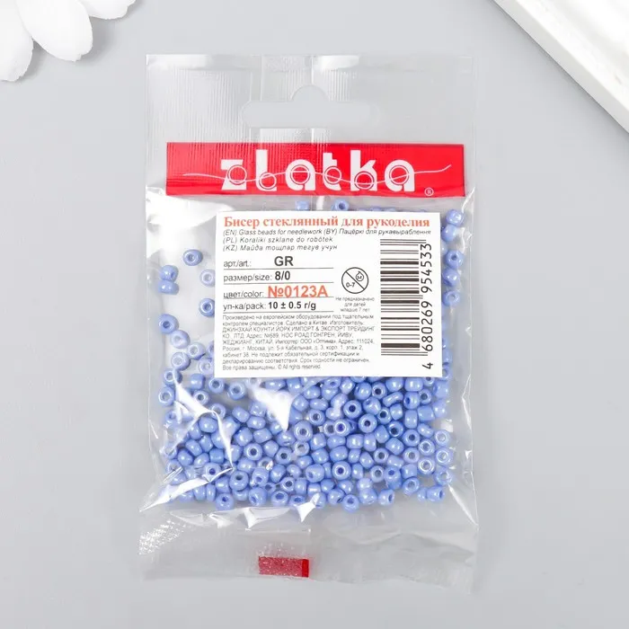 Бисер "Zlatka" 08/0, 3 мм, 10 г 0123A т. голубой — Характеристики