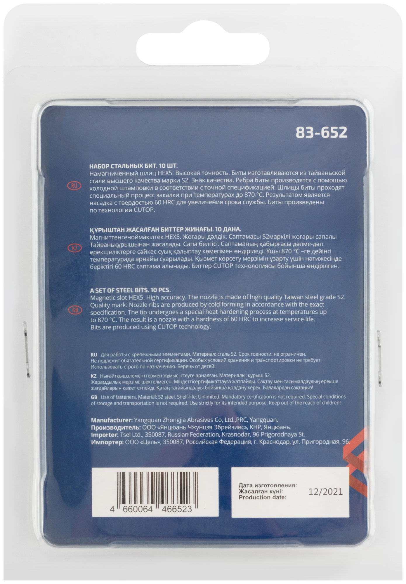 Биты изготовлены из тайваньской стали высшего качества марки S2. Их ребра произведены с помощью холодной штамповки, а кончик проходит специальный процесс закалки при температуре до 870°C. Это обеспечивает твердость 60 HRC и увеличенный срок службы.
