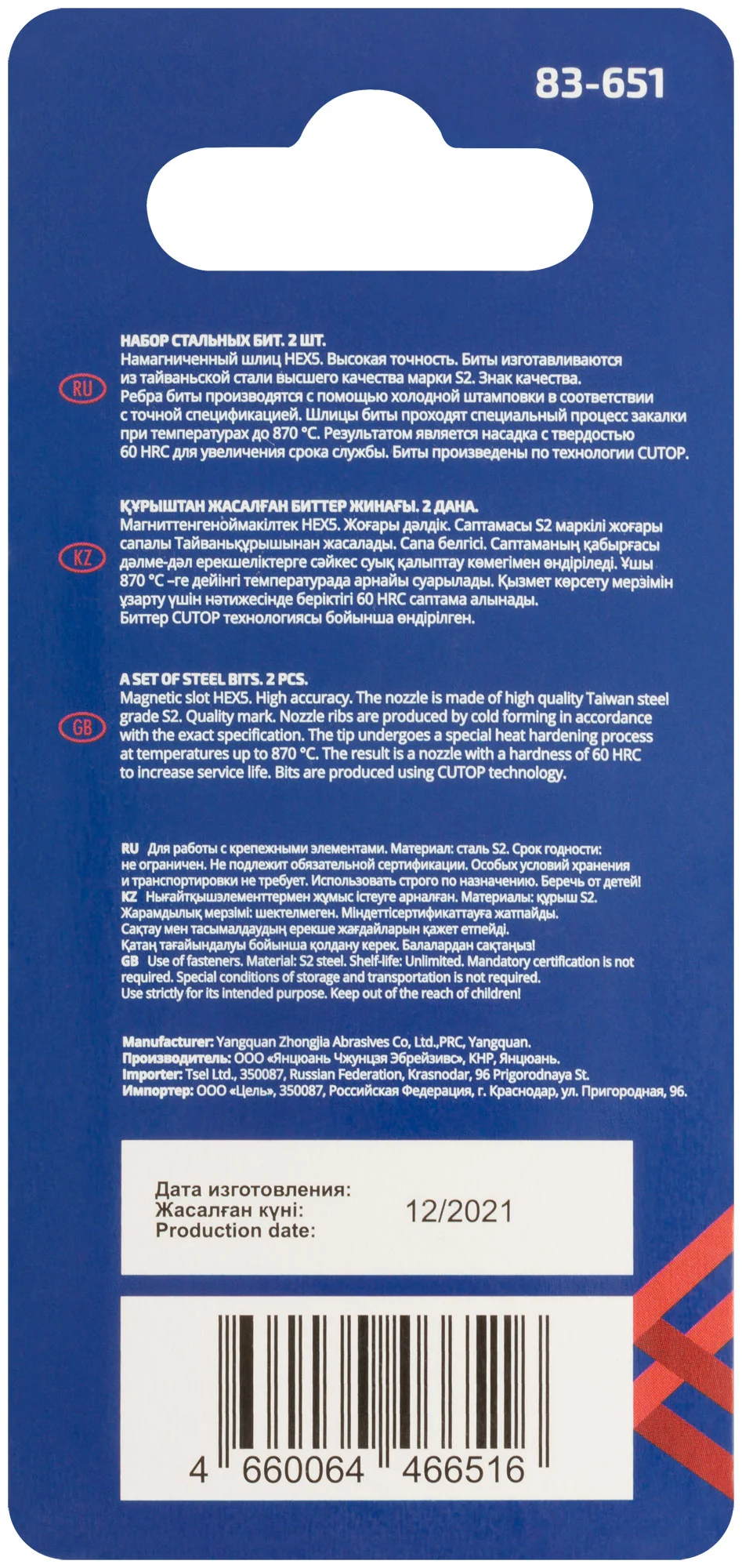 Биты стальные, 2 шт., CUTOP Profi, HEX5, 50 мм