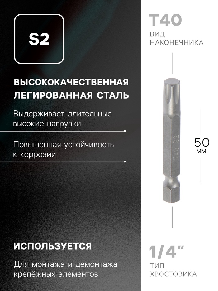 Намагниченные биты с наконечником T40 из стали S2 – надёжное решение для работы с крепежом. Длина 50 мм обеспечивает комфорт при выполнении задач в ограниченном пространстве.