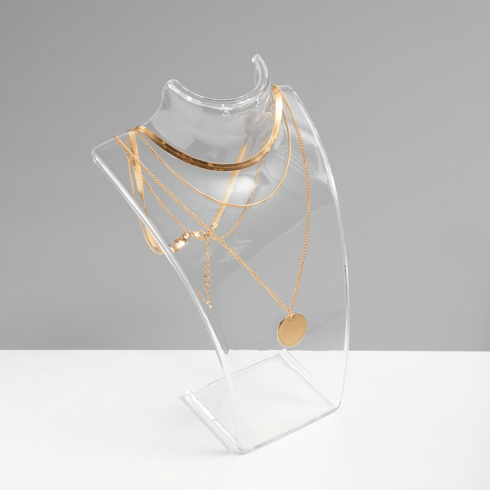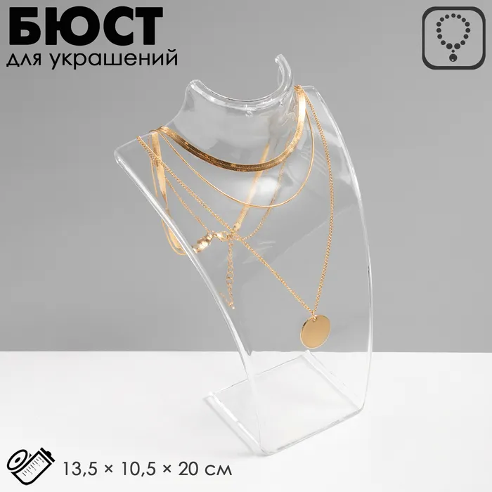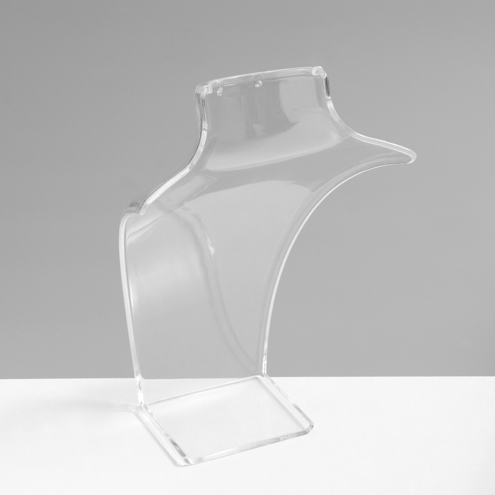 Изготовленный из высококачественного пластика, этот бюст не только прочный, но и легкий, что обеспечивает его мобильность и удобство в использовании. Его форма, напоминающая стройный силуэт, позволяет элегантно продемонстрировать ваши любимые украшения, превращая их в часть декора. Прозрачный цвет добавляет легкости и визуальной воздушности, при этом не отвлекая внимание от самих украшений.