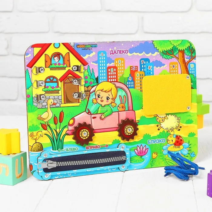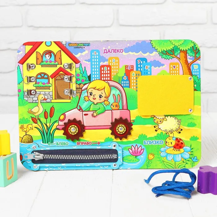 Бизиборд «Близко-далеко» стимулирует развитие логического мышления, памяти и воображения. Ребёнок учится различать расстояния, завязывать шнуровку и работать с замком-молнией, что тренирует тактильные ощущения и навыки самостоятельности. Игра с бизибордом помогает формировать причинно-следственные связи и развивает познавательную активность. Это не только занимательное занятие, но и источник радости и удивления для малыша.