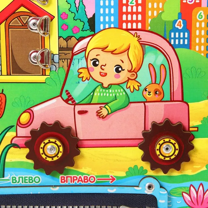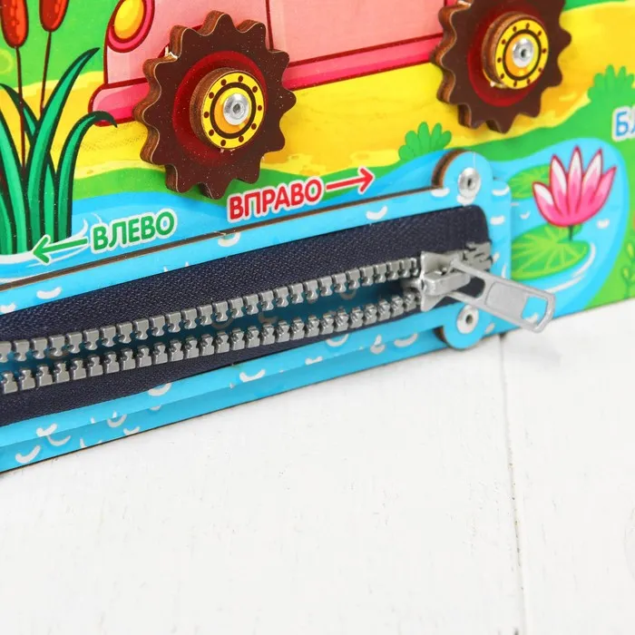 - Включает интерактивные элементы: молнию, шестерёнки и шнуровку, которые развивают мелкую моторику и координацию движений.