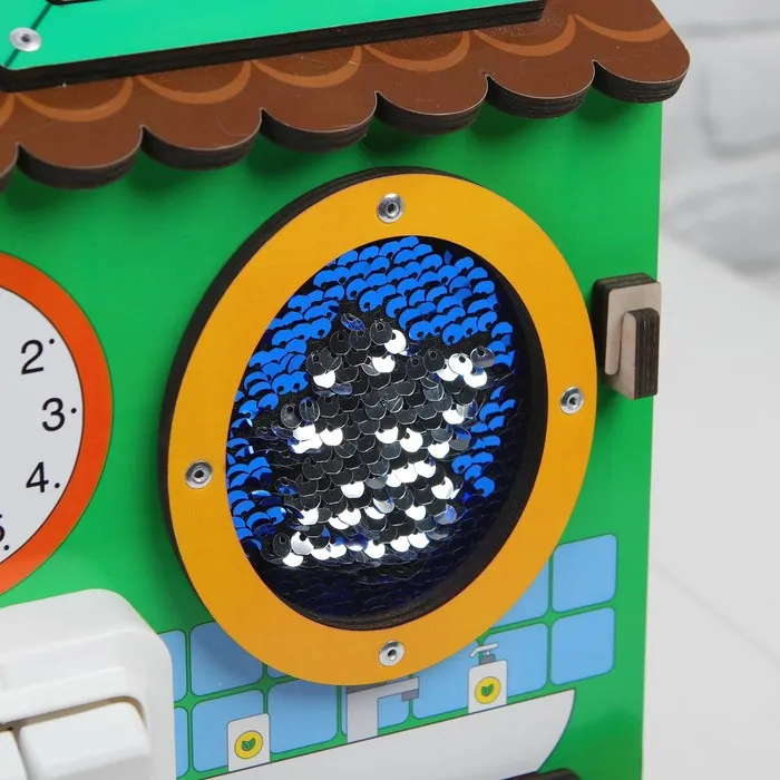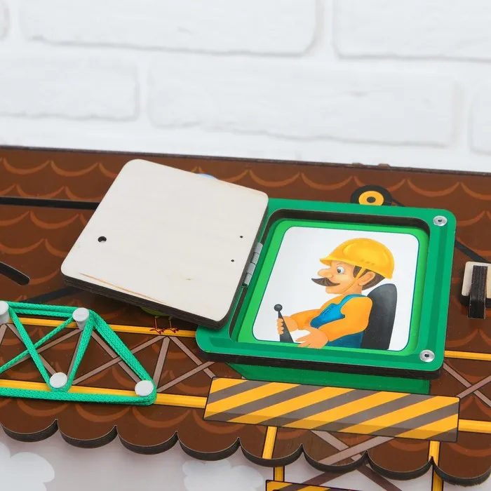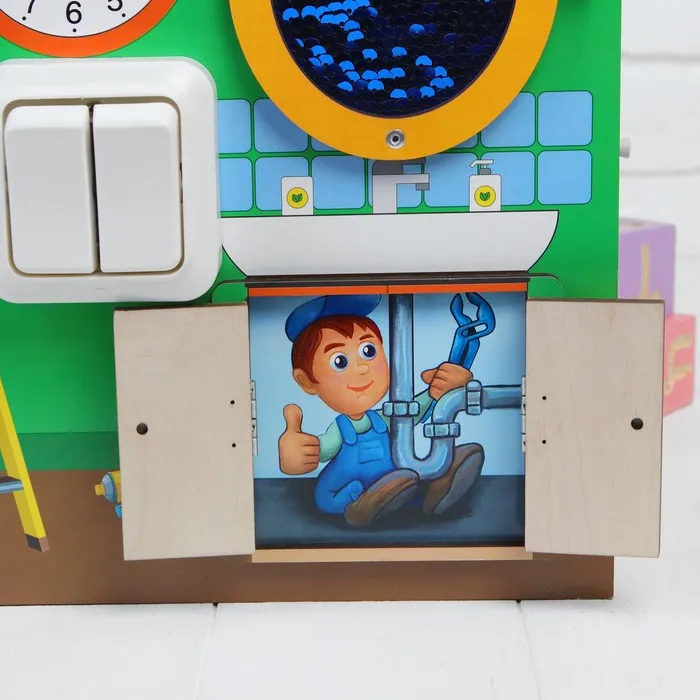 Правильно сделанный, хорошо продуманный ещё на этапе проектирования, бизиборд имеет много маленьких деталей, которые не просто можно трогать, но и совершать с ними определённые действия: щёлкать выключателем, втыкать вилку в розетку, нажимать кнопки, защёлкивать щеколду и прочее. Всё это тренирует маленькие пальчики, а ещё – учит обращению с реальными аналогами этих предметов в быту.