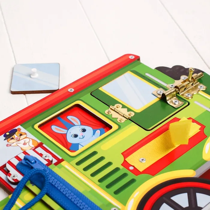Бизиборд - доска, в процессе игры с которой ребёнок будет познавать мир, ознакомится с предметами быта, а также получит навыки самообслуживания (завязывание шнурков, застёгивание молнии и мн.др).