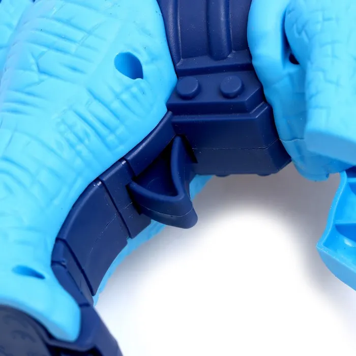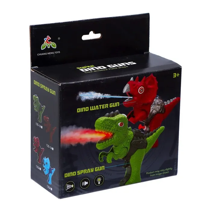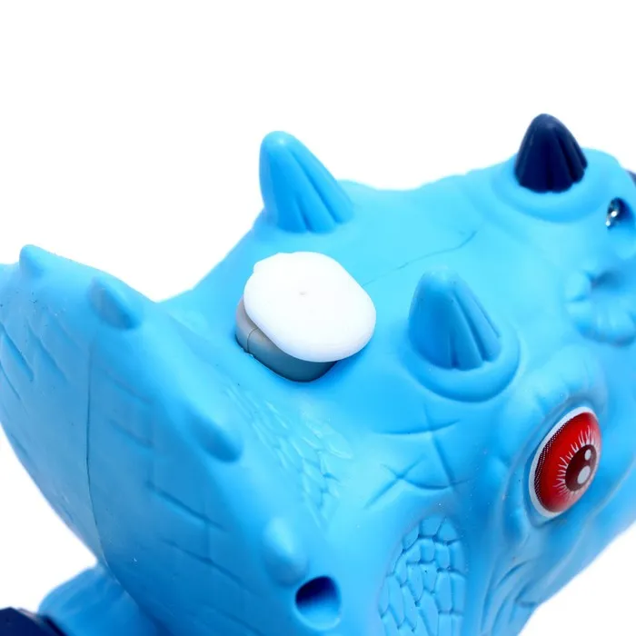 - Игрушка выпускает пар. Для этого необходимо залить воду в бластер через крышечку на голове динозавра.