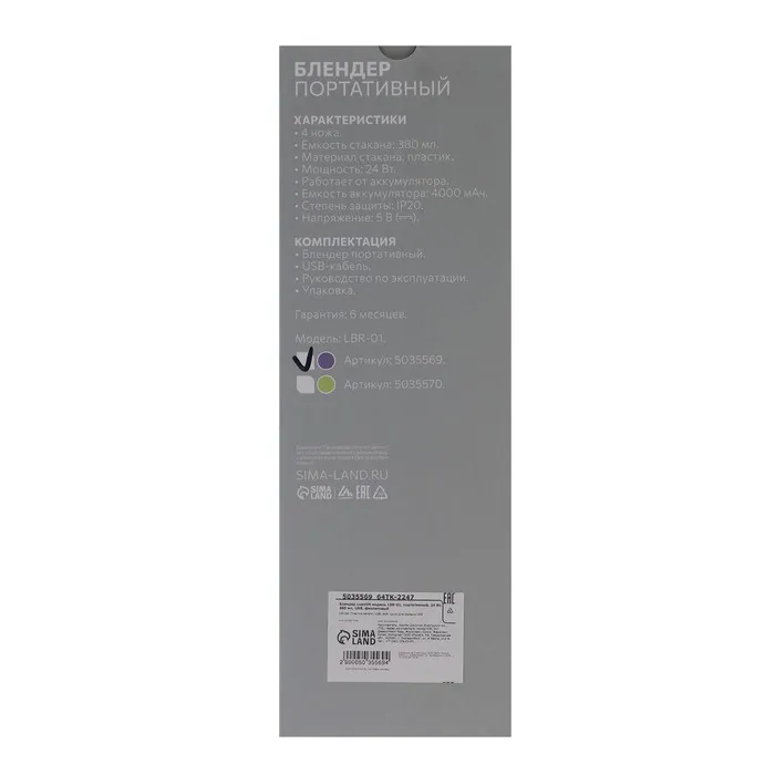 Блендер Luazon LBR-01, портативный, 24 Вт, 380 мл, USB, фиолетовый — Характеристики