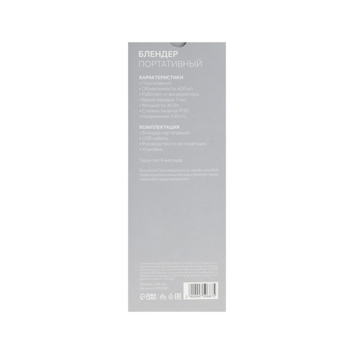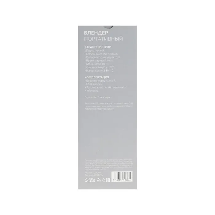 Блендер Luazon LBR-04, портативный, 420 мл, 40 Вт, АКБ, белый — Характеристики