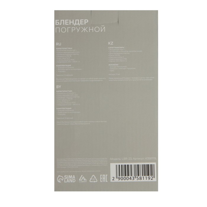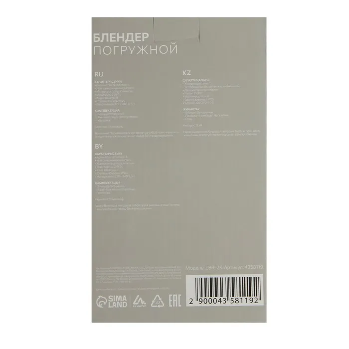 Блендер Luazon LBR-23, погружной, 250 Вт, 1 скорость, бело-фиолетовый — Характеристики
