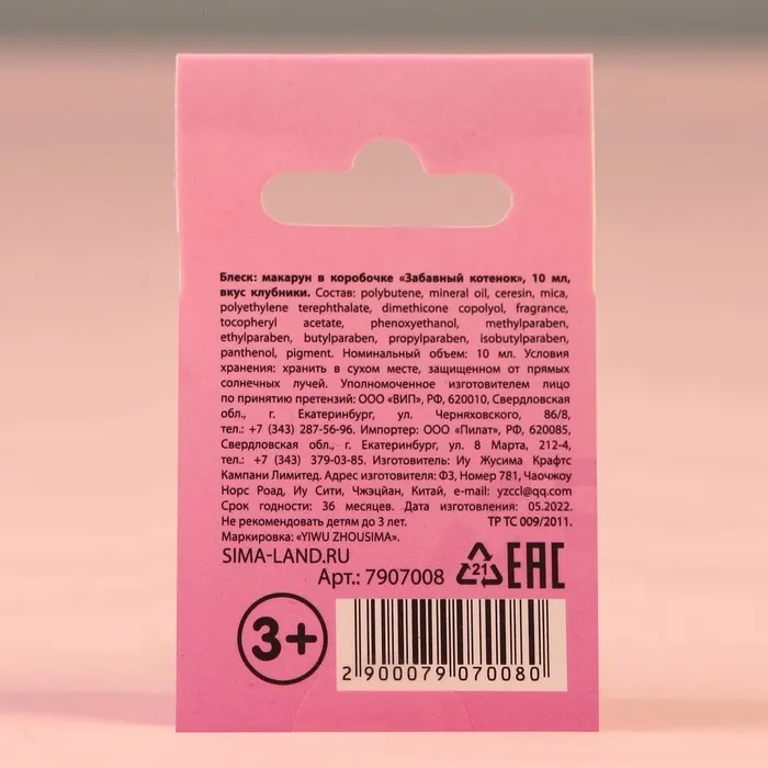 Блеск для губ макарун детский «Забавный котёнок», 10 г, аромат клубники — Характеристики