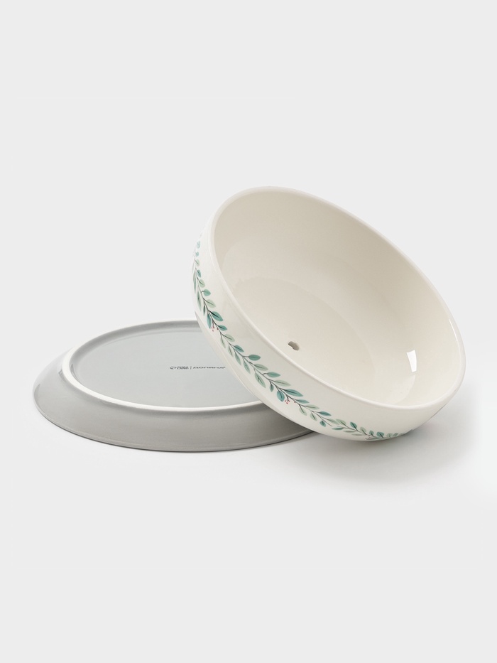 Эта праздничная блинница с крышкой станет уютным дополнением новогоднего стола. В бело-серой блиннице угадывается роспись — домашние гномики создают атмосферу зимней сказки. Диаметр 23.5 см удобен для порционных блинчиков, а натуральный доломит бережно сохраняет тепло.