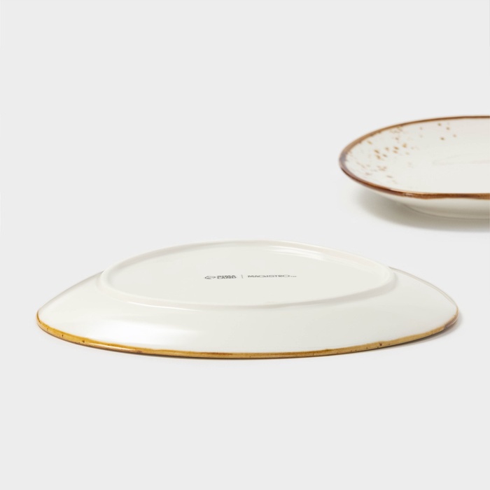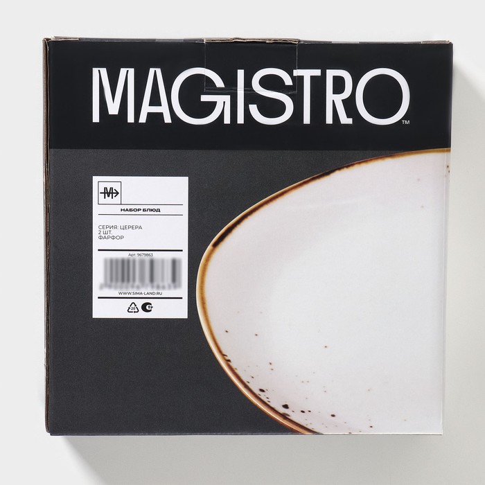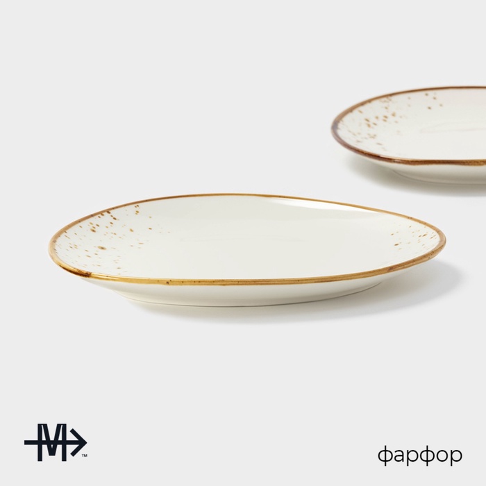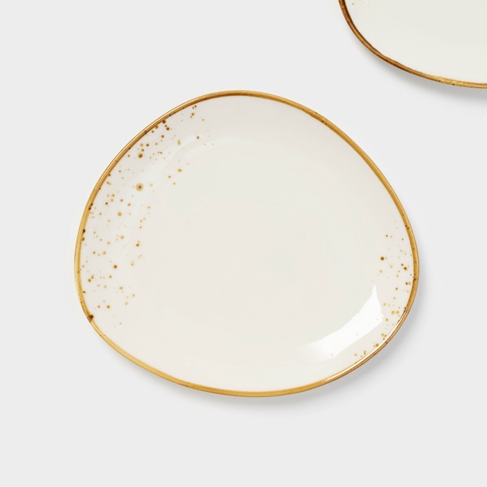 Ассиметричные блюда «Церера» от Magistro — пара белых фарфоровых тарелок с деколем в крапинку для стильной подачи закусок, десертов или гарниров. Их нестандартный силуэт и компактные размеры (18×16 см) подходят для составления дуэтов, мини-порций или сервировки в стиле «мезе». Поверхность выдерживает нагрев в СВЧ и чистку в посудомоечной машине, сохраняя чёткость рисунка и блеск глазури.