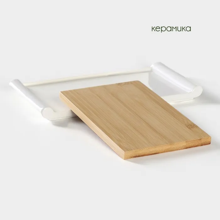 Изделие выполнено из качественной керамики и имеет вставку в виде досочки из бамбука. Подойдет для закусок, десертов, подачи фруктов, даже для вторых блюд.