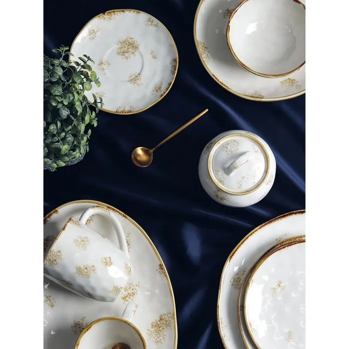 Оригинальная коллекция посуды Organic Gold от торговой марки Доляна не оставит никого равнодушным! Вся серия изготовлена из прочного фарфора и обладает неповторимым дизайном: рельефная «мятая» текстура и эффект золотой насыпи. Несмотря на свой изящный внешний вид, посуда рассчитана на ежедневное использование.