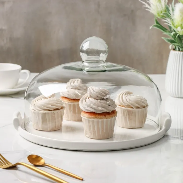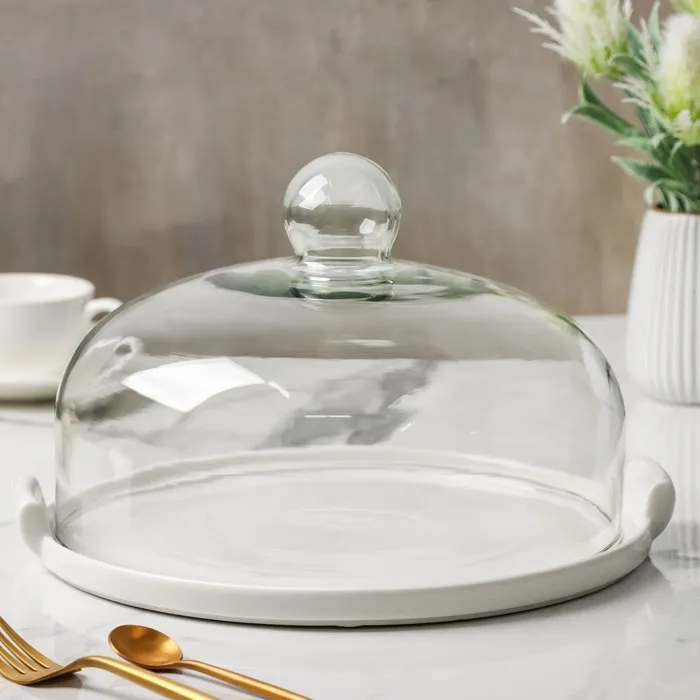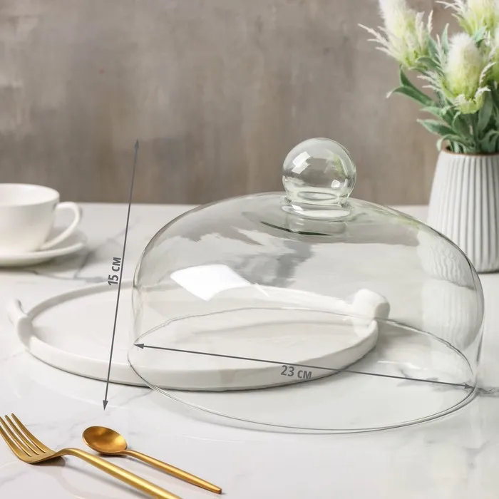 Подставка для торта со стеклянной крышкой и керамическим блюдом с ручками. Крышка изготовлена из натриевого-известкового стекла с низким содержанием металлов, стекло абсолютно прозрачное, бесцветное и обладает повышенным блеском. Крышка ударопрочная и термостойкая, устойчива к вредному воздействию воды и не мутнеет после длительного использования.