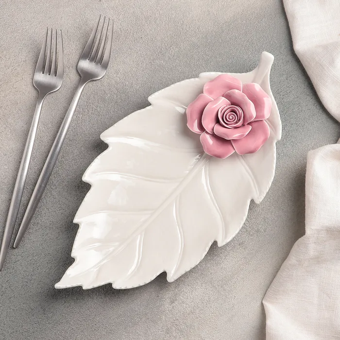 Блюдо керамическое сервировочное «Лист с розой», 27×14×4,5 см, цвет бело-розовый