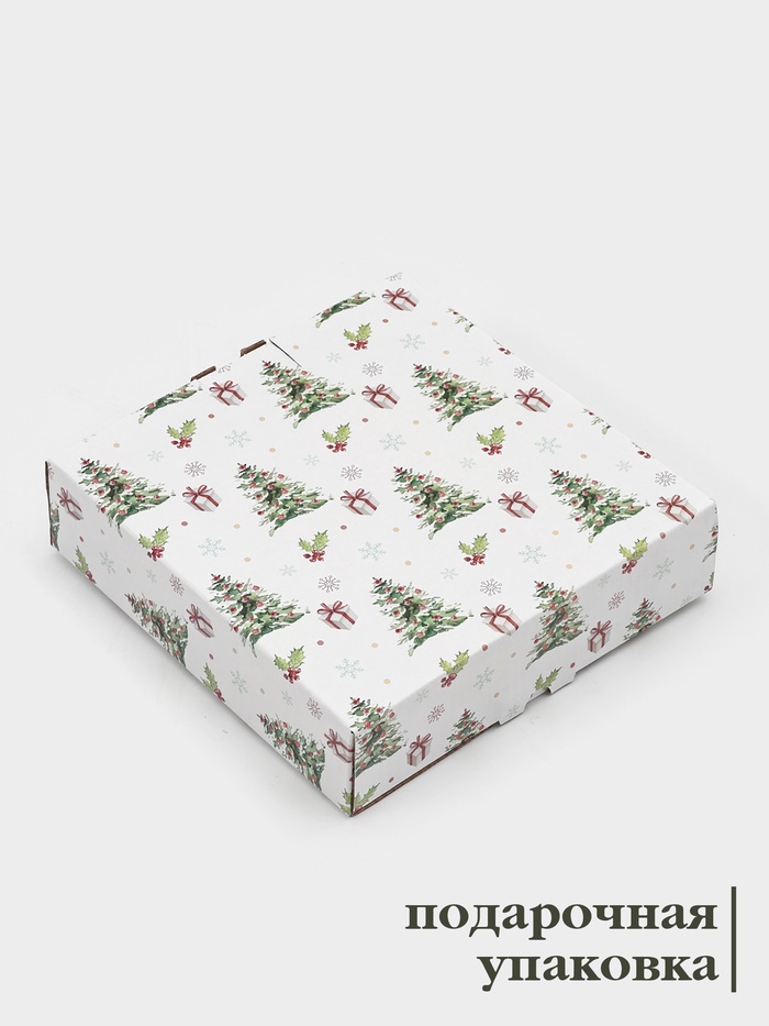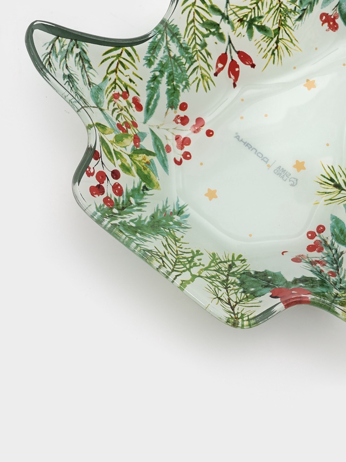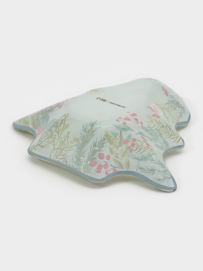 Сервировочное блюдо — это фигурное стеклянное блюдо с новогодним рисунком в бело-зелёной гамме. Его необычный контур и лаконичная графика превращают подачу угощений в часть праздничного оформления.