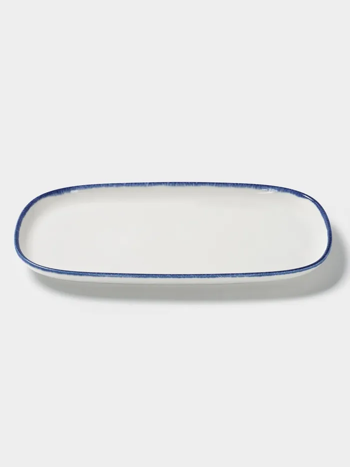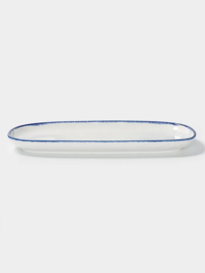Создавайте эффектные гастрономические композиции на фарфоровом блюде размером 35×17 см. Его белоснежная поверхность с голубой полосой напоминает морской прибой, а овальная форма идеально подходит для презентации закусок, сырных нарезок и десертов. Бортики высотой 1.9 см помогают аккуратно размещать продукты.