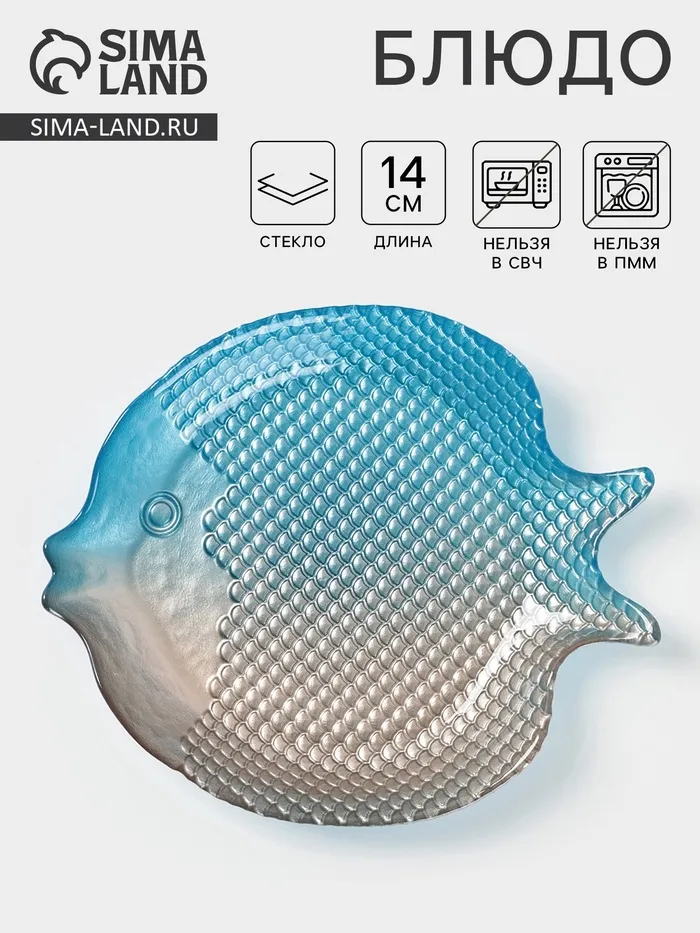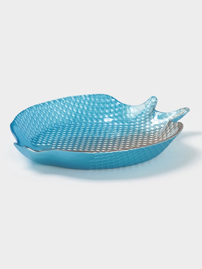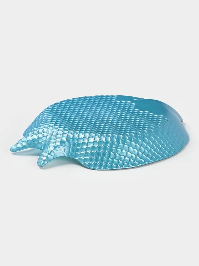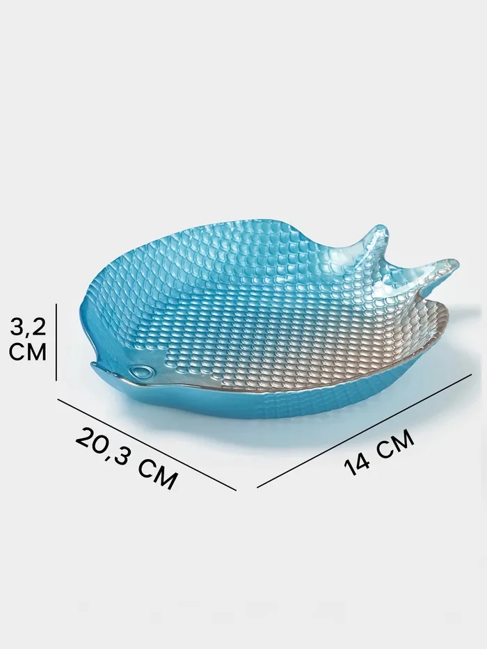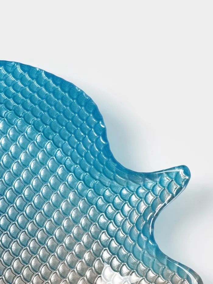 Фигурная плоская форма рыбы с рельефной текстурой напоминает море и океан, подчеркивая тематику посуды и добавляя глубину визуальному восприятию.