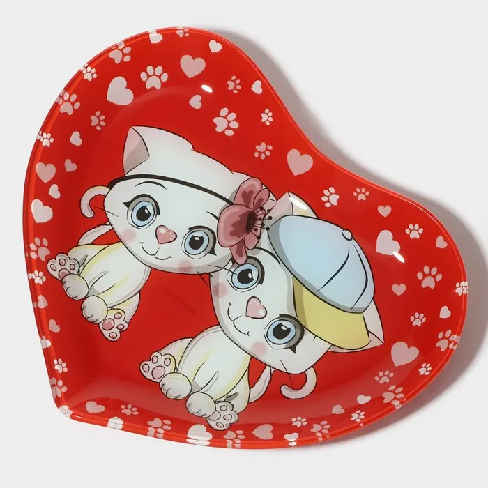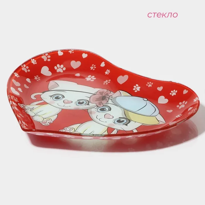 Блюдо стеклянное сервировочное Доляна «Сердце. Котики», 25×21×2,3 см, цвет красный — Характеристики