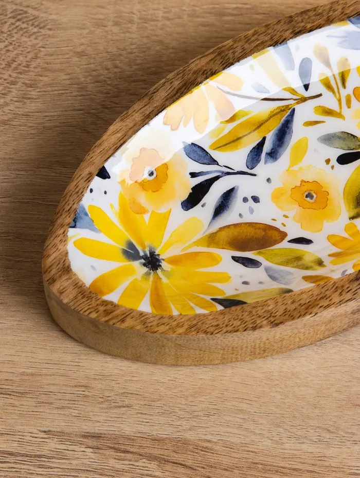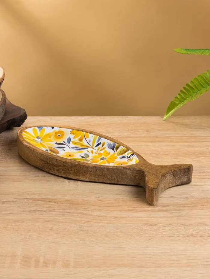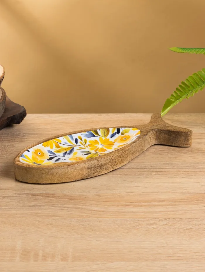 Блюдо в форме рыбки «Желтые и синие цветы», 25.5×10×2 см, дерево манго — Характеристики