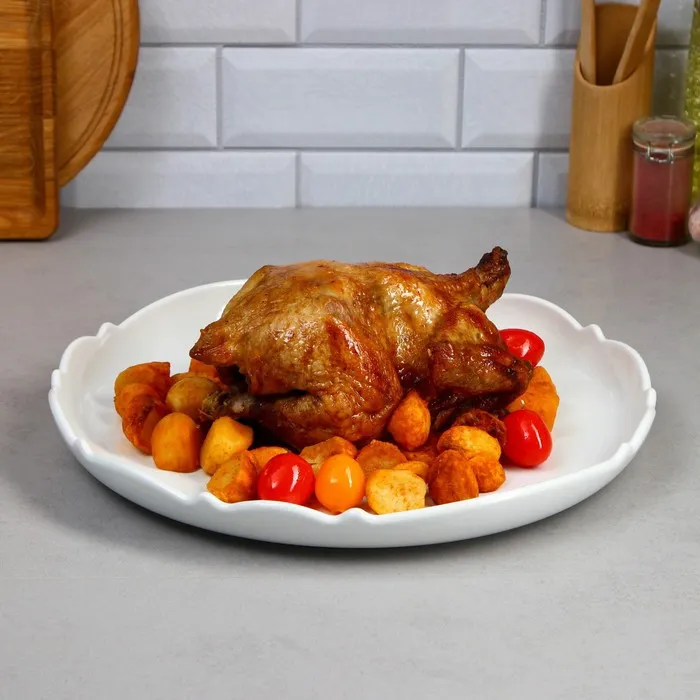 Элегантное фарфоровое блюдо - идеальный выбор для сервировки любых блюд. Блюдо из фарфора украсит любой стол и добавит изысканности вашей еде. Подходит для сервировки салатов, пасты, суши, закусок, а также холодца, рыбы, мяса и других блюд. Белый цвет и его гладкая текстура придают блюду изящный и элегантный вид, который подойдет для разных мероприятий и столовых сервировок. Также может использоваться в качестве декоративной подставки для фруктов, сыра и других украшений на вашем столе. Идеально подходит для сервировки различных явств на столе в кафе, ресторане, столовой или дома. Благодаря его форме и размеру, вы можете разнообразить ваше меню, включая нарезки, печенье, картофель фри, салаты, варенье, фрукты и сладости. Независимо от того, используется ли оно на свадьбе, вечеринке или просто для ужина в кругу семьи, это блюдо будет удачным выбором для подачи.