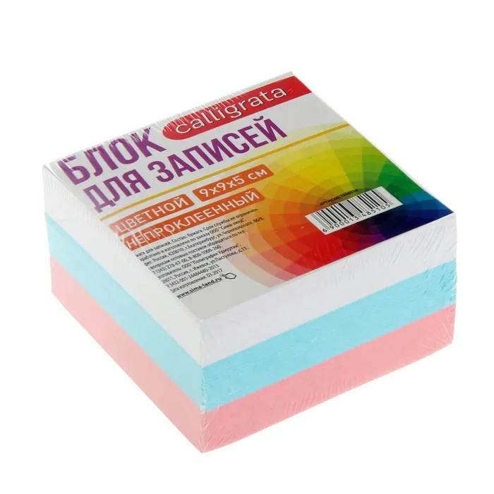 Блок бумаги для записей Calligrata "Триколор", 9x9x5 см, 80 г/м2, непроклеенный, цветной — Характеристики