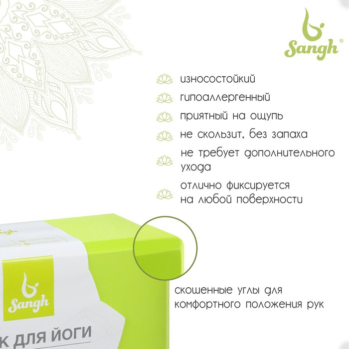 Блок для йоги Sangh, 23х15х8 см, цвет зелёный — Характеристики