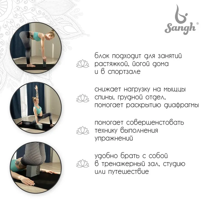 Йога-блок (йога-кирпич) применяется для создания дополнительной точки опоры. Он помогает развивать гибкость постепенно, без лишнего напряжения в мышцах и суставах. Необходим для тех, кто только начинает заниматься йогой, и кому не хватает гибкости, чтобы иметь правильную опору для рук и ног при выполнении асан.